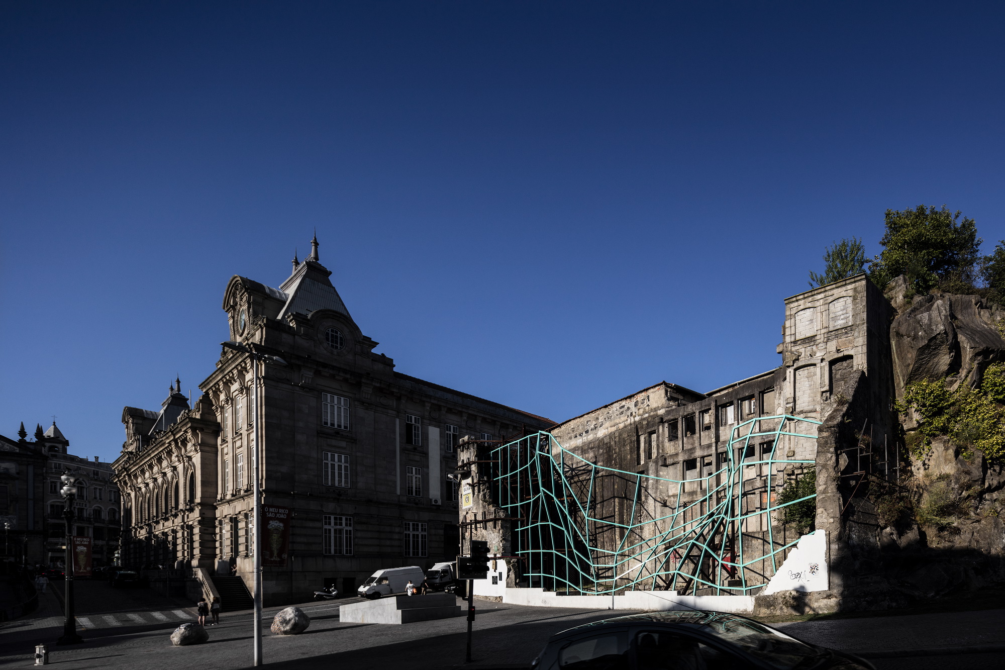 Se a prática manda organizar, melhorar, condicionar, aqui a regra é indefinir. Inaugurada em outubro de 2021, no edifício histórico do antigo matadouro Legazpi, em Madrid, a instalação La Hoja é disso uma boa metáfora. Trata-se de um espaço de encontro, de cultura, que “não está acabado, não é conclusivo, não está inteiramente determinado, no qual falta sempre alguém, alguma coisa (…) para se tornar uma lacuna na qual outros se possam encaixar. Um teatro côncavo.” Que, como qualquer outro teatro, só se faz com público: “Quando as pessoas usarem o espaço é que vão completar algum sentido da obra. Não faz sentido nós sermos os totais manipuladores do espaço, o espaço não nos pertence, nós damos apenas umas diretrizes e lançamos perguntas.” Pistas, sugere Hugo Reis: “Nas últimas décadas, tem-se discutido ao nível do urbanismo como alcançar a incerteza. E é impossível, porque não é possível desenhar um espaço que sirva para tudo, que sirva para abarcar todo o tipo de funções/usos de cada indivíduo. No entanto, nós podemos deixar pistas. E o nosso trabalho às vezes não tem de encerrar; pode abrir. Gostamos sempre de deixar alguma coisa incompleta.”