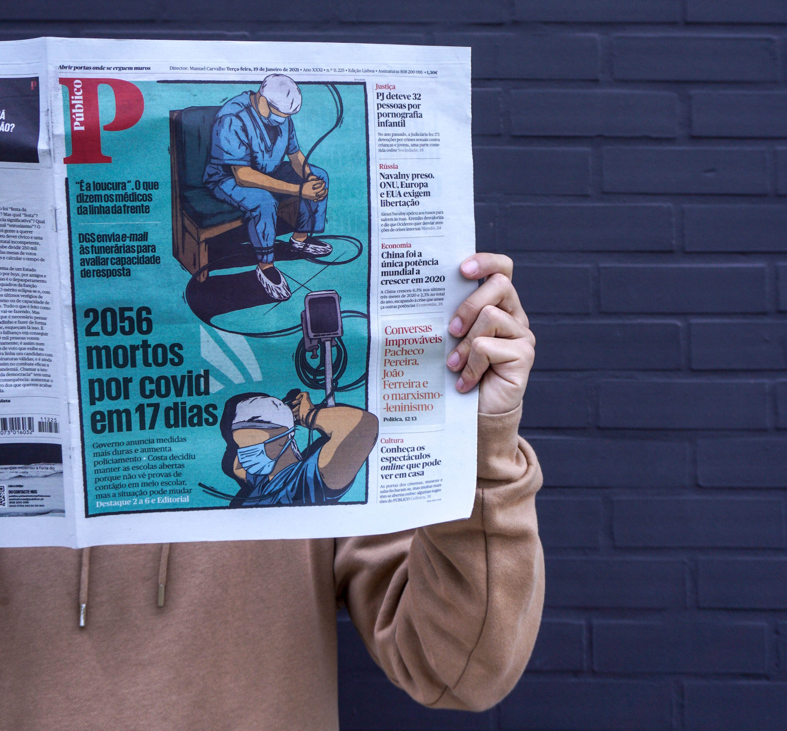 Capa do Público de 19 de janeiro de 2021, a primeira capa de um jornal ilustrada por Effe.
